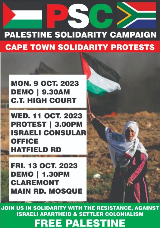 Solidarity demonstrations for the Palestinian people and their resistance against Israeli occupation is set to take place on Wednesday in Cape Town. The Palestine Solidarity Campaign (PSC) is staging a picket at the Israel Centre. A demonstration will also take place at St George’s Cathedral in the CBD at 1pm.