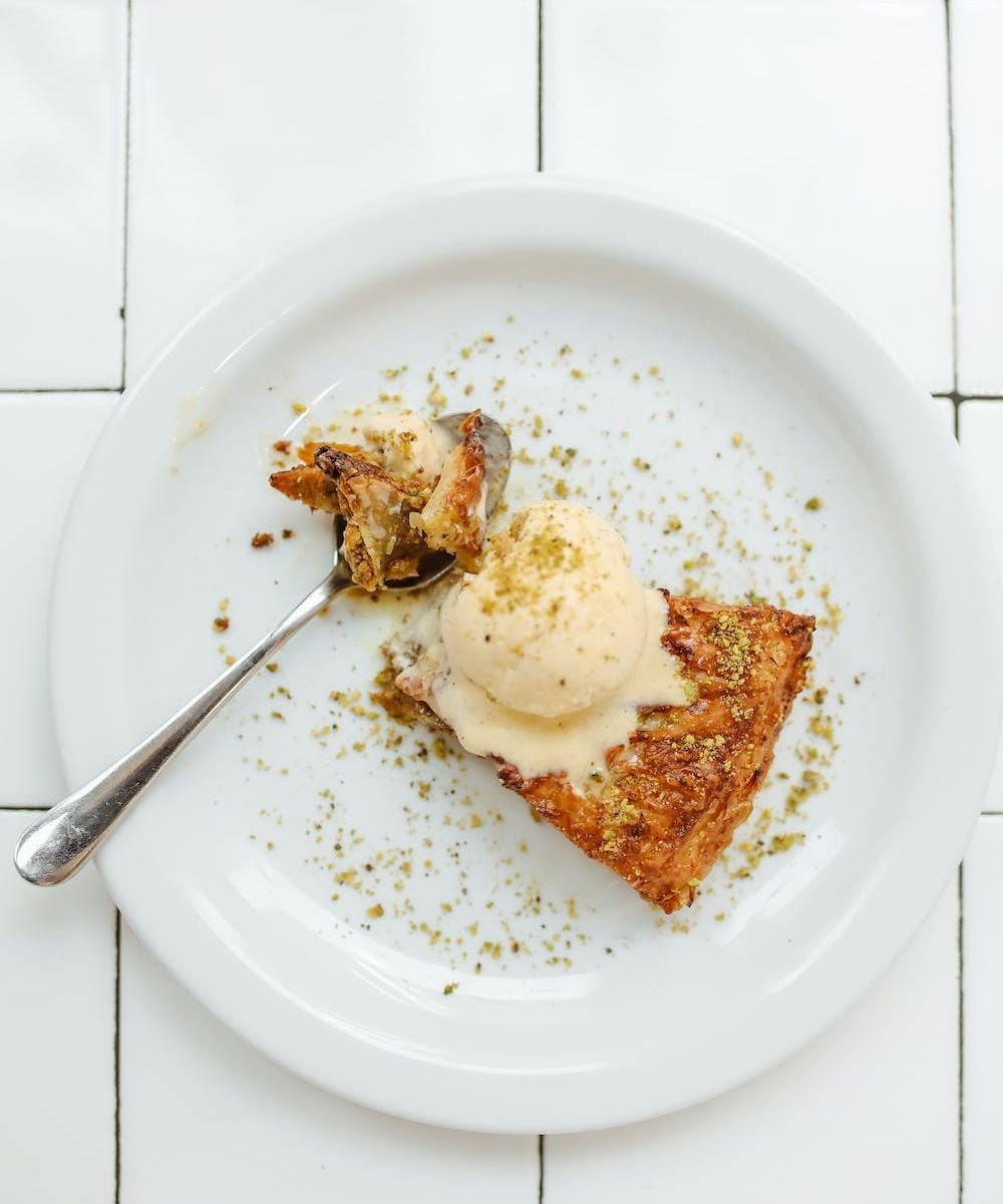 Enjoy a warm slice of Baklava cake with a generous scoop of ice cream