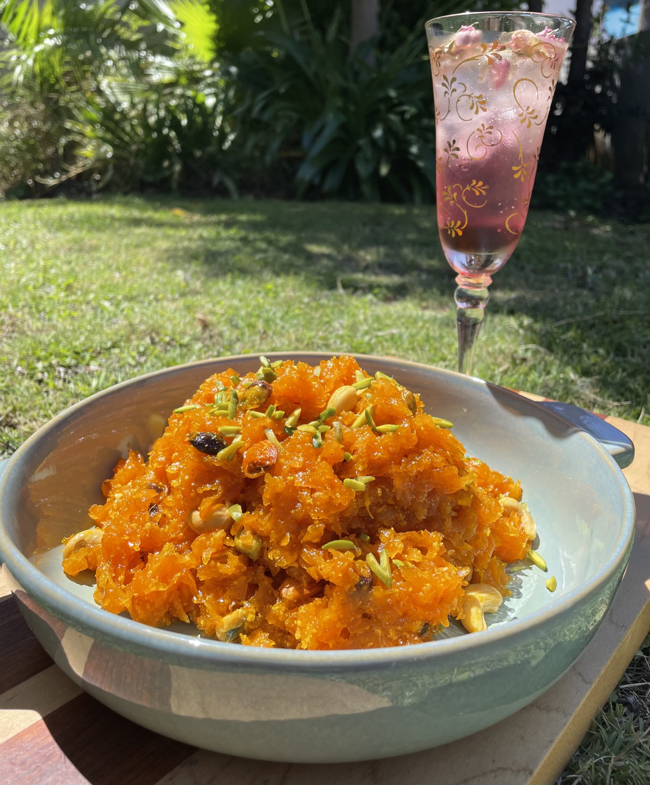 Pour the hot ghee and nuts over the halwa and incorporate. To serve, garnish the halwa with chopped up pistachios and enjoy.