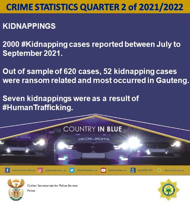 This was revealed in the quarterly crime statistics. In those three months, 2 000 cases of kidnapping were recorded in South Africa.