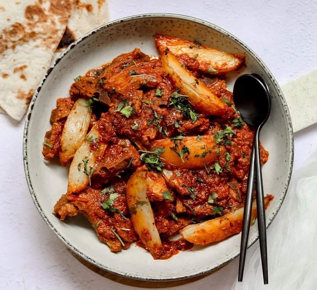 Add in a cup of water and cook with lid on until liquid starts to thicken. At this stage add in your tomatoes, prepped potatoes and 1/2 cup water. Place heat on low, cook with lid on until a lovely thick gravy forms. Garnish with dhania.