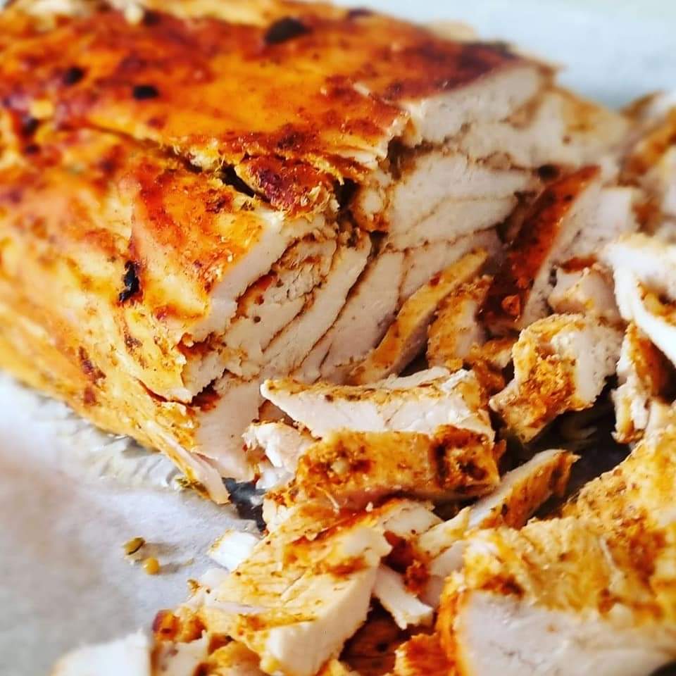 Thinly slice the chicken breast in 3 slices (lengthwise) and season with the all the above spices