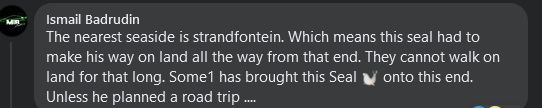 Mystery surrounds how an adult female Cape Fur Seal landed on Jakes Gerwel Drive near Gatesville on Wednesday morning.