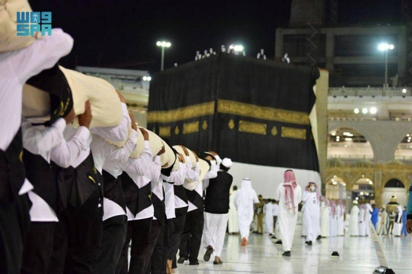 Deputy Head of the General Presidency for the Grand Mosque Affairs Dr. Saad bin Mohammad Al-Mohaimeed said, in a statement, that the Kaaba cloth is made of 670 kg of high-quality silk, 120 kg of gold threads, and 100 kg of silver threads.
