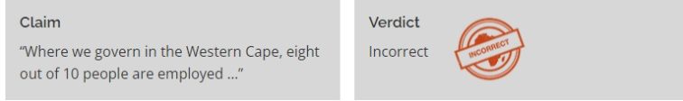 - While the latest official unemployment rate for the Western Cape is 20.2%, that doesn’t mean that “eight out of 10” people in the province are employed. And it’s misleading to say that the province was responsible for 78.9% of all jobs in South Africa over the past five years.