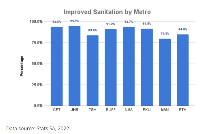 Using the total number of sanitation facilities per metro from Stats SA’s 2022 census, the City of Johannesburg (94.9%) had the highest number of individuals that made use of improved sanitation, followed by Nelson Mandela Bay (93.7%) and the City of Cape Town (93.5%).