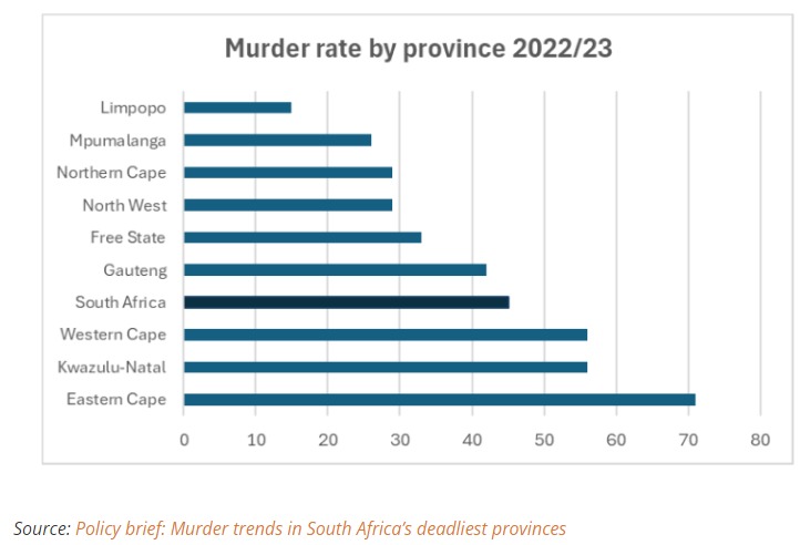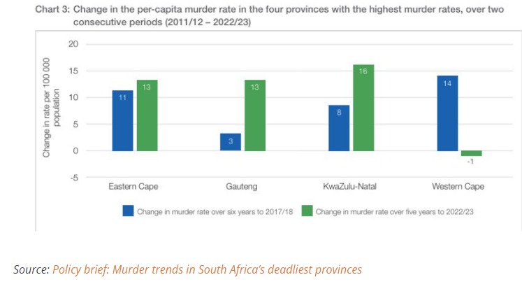For example, while the murder rate decreased slightly in the Western Cape, Gauteng, the Eastern Cape and KwaZulu-Natal have all seen significant increases in the last five years.