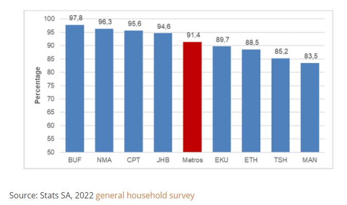 However, in terms of households, the 2022 general household survey showed that the ANC-governed Buffalo City (97.8%) had the highest number of improved sanitation facilities out of all the metros. The DA-governed Tshwane ranked second to last in terms of access to improved sanitation.