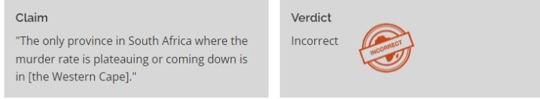 More recent statistics further challenge Winde’s claim. Bruce told Africa Check that the last three quarterly crime reports from the South African Police Service (SAPS) show the province’s murder rate has increased slightly, “by about 5%”.