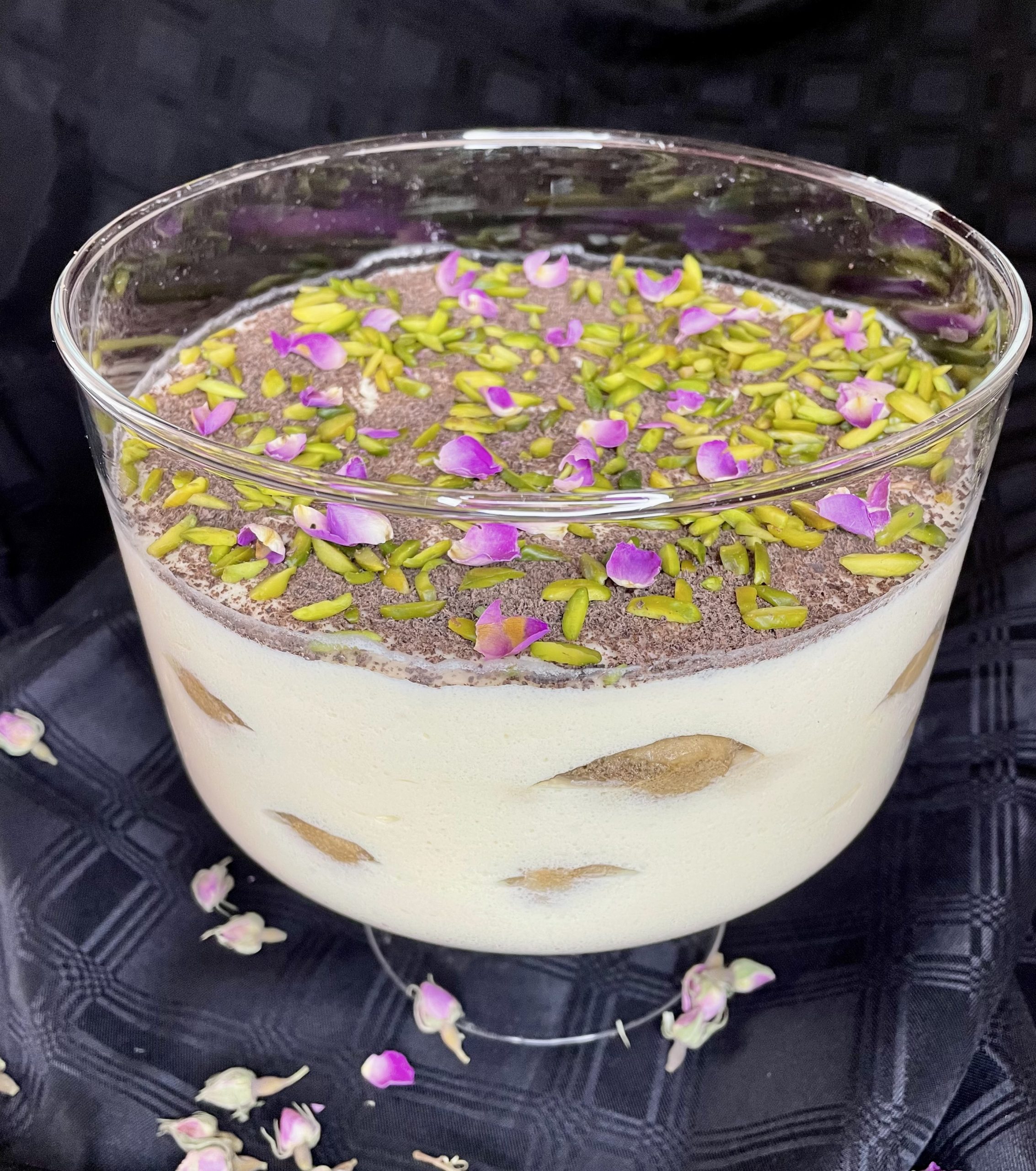 Once set, garnish with grated dark chocolate and rose petals and some sliced pistachios for a pop of green and enjoy.