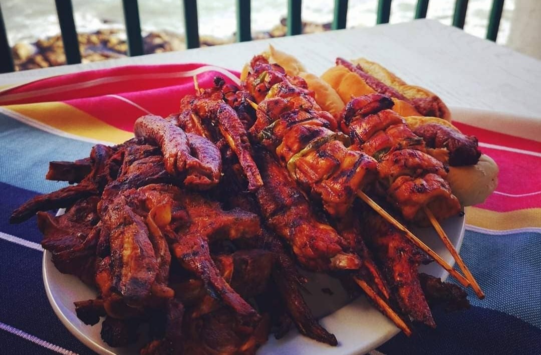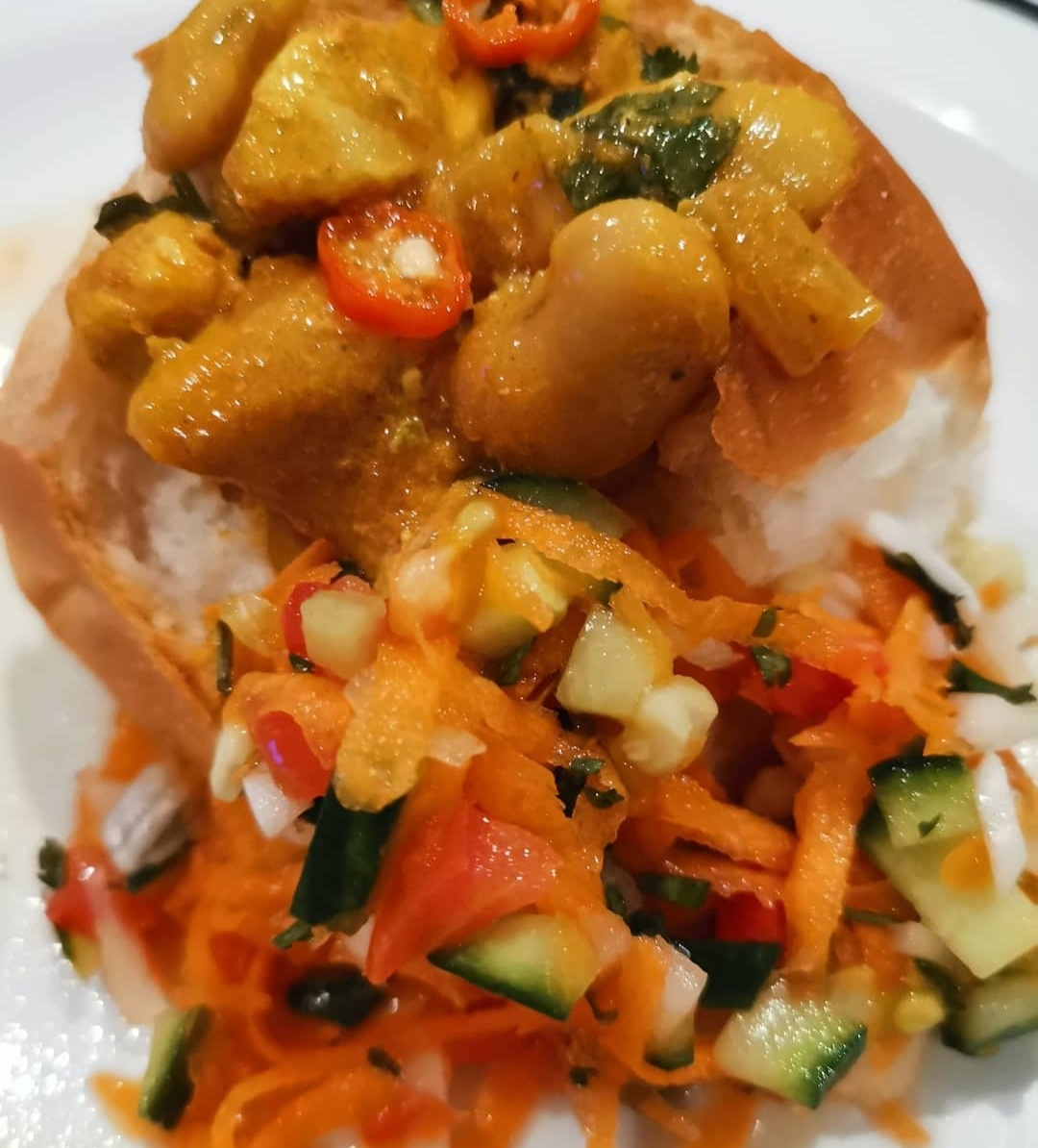 7.Cut a whole in cocktail round roll and fill it with the chicken to make bunny chows and serve with a side of tomato and onion sambal, jam slaai and yoghurt.