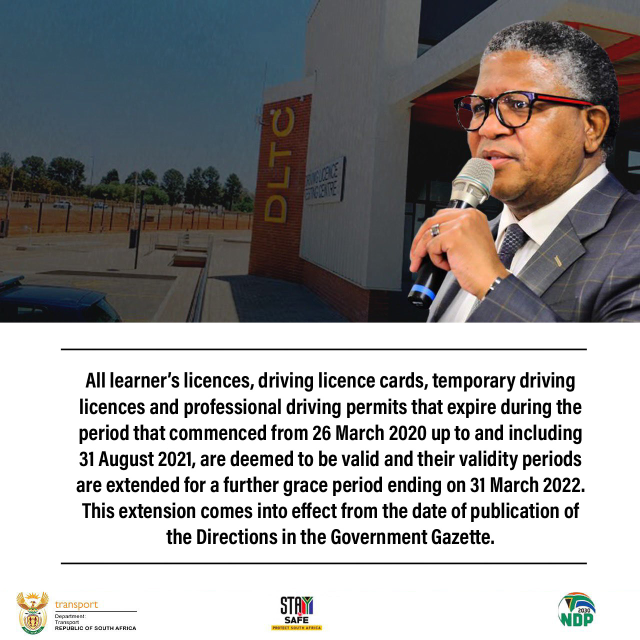 Transport Minister Fikile Mbalula has announced the extension of the grace period for the renewal of driving license cards, temporary driving licenses and PDPs.