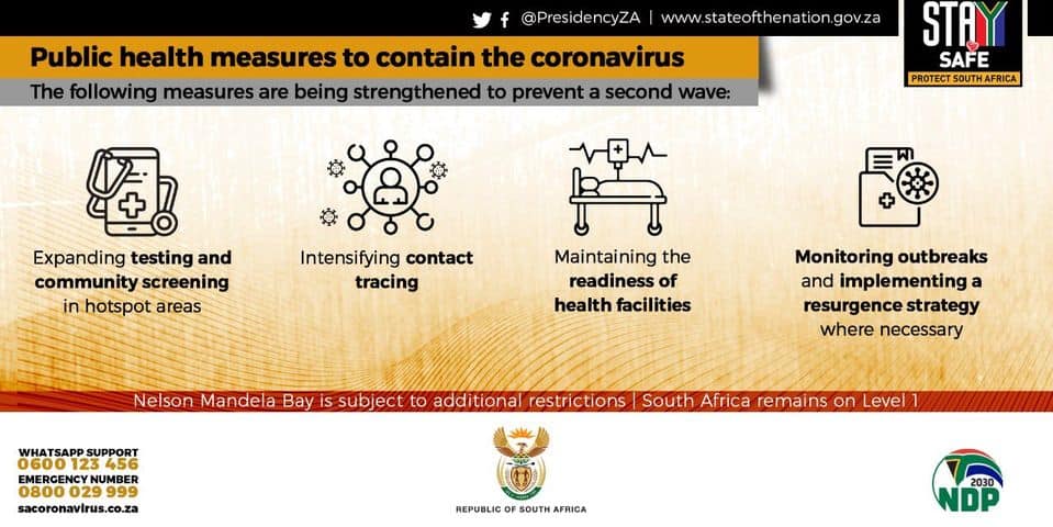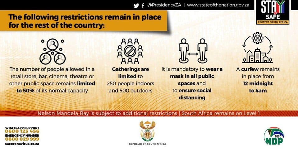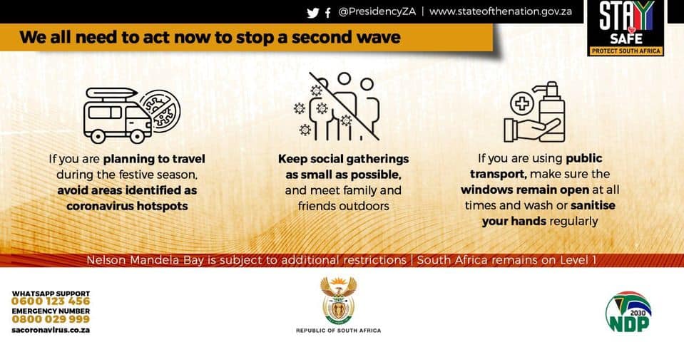 Each of us needs to ensure we take precautions to avoid spreading the virus to our families, especially our elders. We should keep gatherings small, have them outside or in well ventilated venues, ensure social distancing and wear masks as much as possible. We must remember that as much as we want to relax, this virus does not take a holiday. This has been a difficult year for us as a country. It has severely tested our resolve and demanded great sacrifices of each and every one of us. But even as the holidays approach, we cannot let our guard down. – President Cyril Ramaphosa