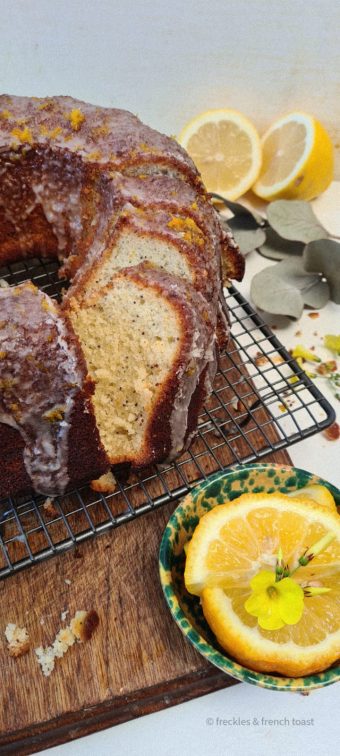 For the glaze, mix together ghe lemon juice and icing sugar and drizzle over your cake. Finish off with some lemon zest.